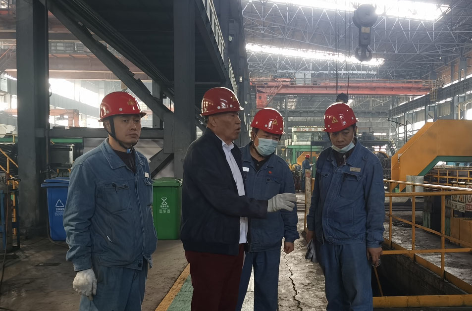 董事長(左二)在軋鋼廠檢修現(xiàn)場視察,公司副總經(jīng)理路士洪(右二)、軋鋼廠廠長馬振廣(右一)、軋鋼廠成品車間副主任李樹生(左一)等主要領導全程陪同