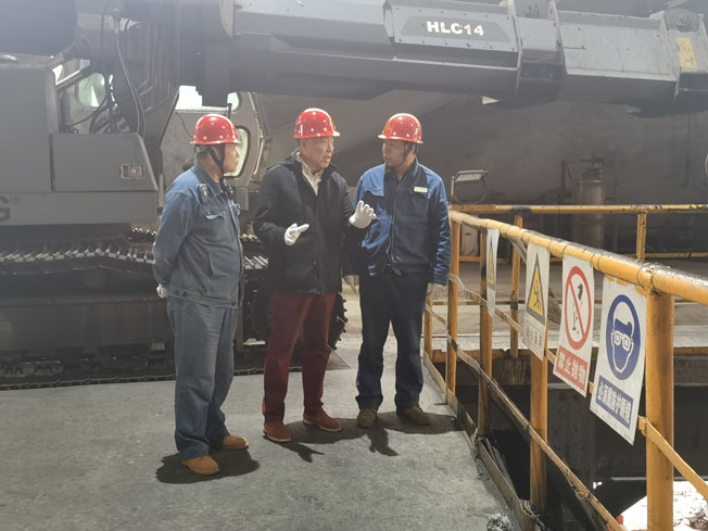 董事長(左二)在煉鋼廠檢修現(xiàn)場視察,公司副總調度長李成哲(左一)、煉鋼廠廠長閆海龍(右一)等主要領導全程陪同