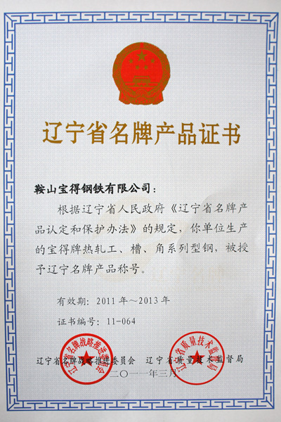 2011年3月,公司生產(chǎn)“寶得”牌熱軋工、槽、角系列型鋼,被遼寧省名牌戰(zhàn)略推進(jìn)委員會、遼寧省質(zhì)量技術(shù)監(jiān)督局授予“遼寧省名牌產(chǎn)品”稱號。